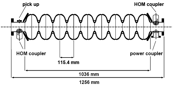 Side view of the 9-cell cavity with the main power coupler port (right), the pick up probe (left),