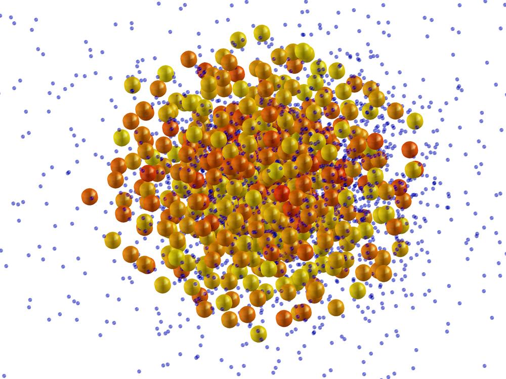 Exploding xenon cluster with liberated electrons (blue dots). Credit: Thomas Fennel/University of Rostock