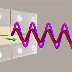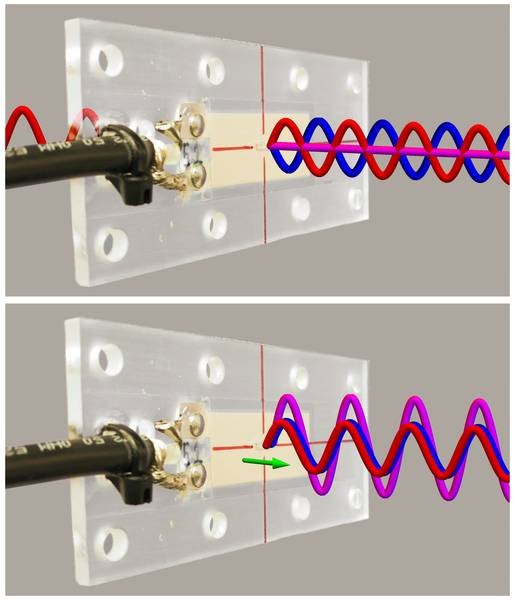 Before motion (top) the light scattered by the target (blue) extinguishes the excitation (red). After the motion (bottom), the scattered light is displaced and the waves enhance each other (magenta). Credit: MPIK Linkhttps://idw-online.de/de/image?id=290969&size=screen