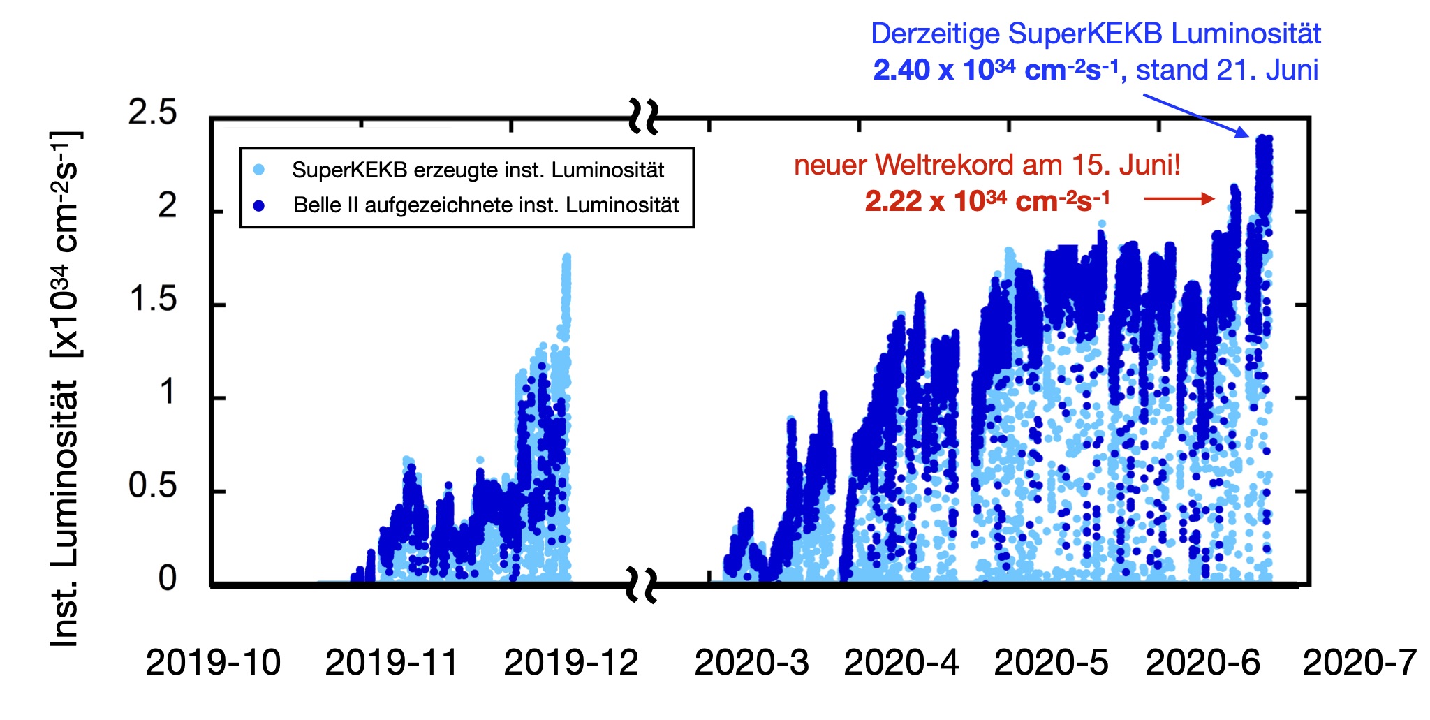 Luminosity plays a key role here. It indicates how many particles are gathered per second and square centimeter. It is thus a factor for the number of collisions that take place and which can be evaluated in the Belle II detector. The more measurement data, the higher the probability of finding rare decay. On 15 June 2020, the value was 2.22 × 1034 cm−2s−1.