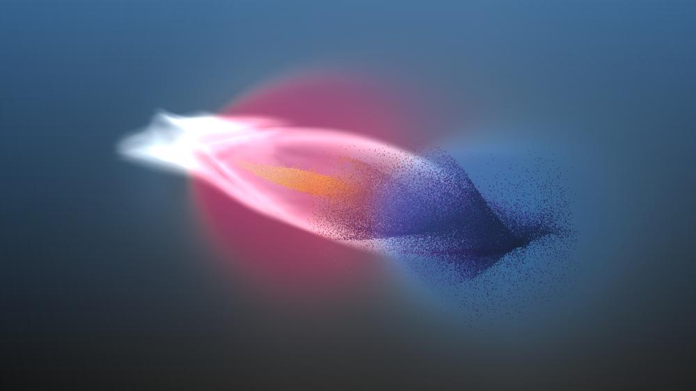 An electron bunch with varying energy (dark blue to orange) drives a plasma wave (white) with strong electric fields (red and blue). Removing thin slices from the tail of the electron bunch in a controlled manner allows the precise measurement of the electric fields. Credit: DESY, Ángel Ferran Pousa