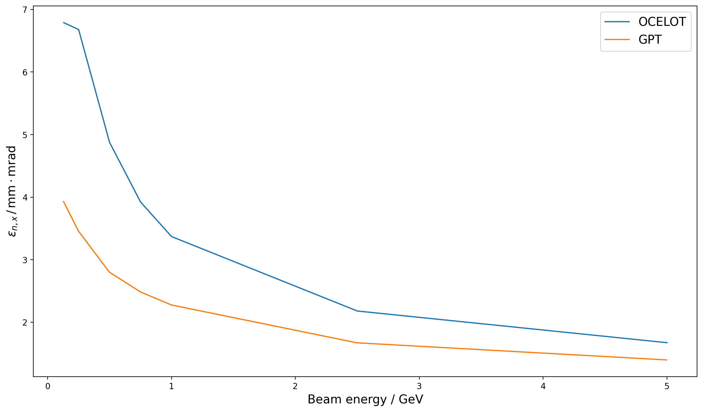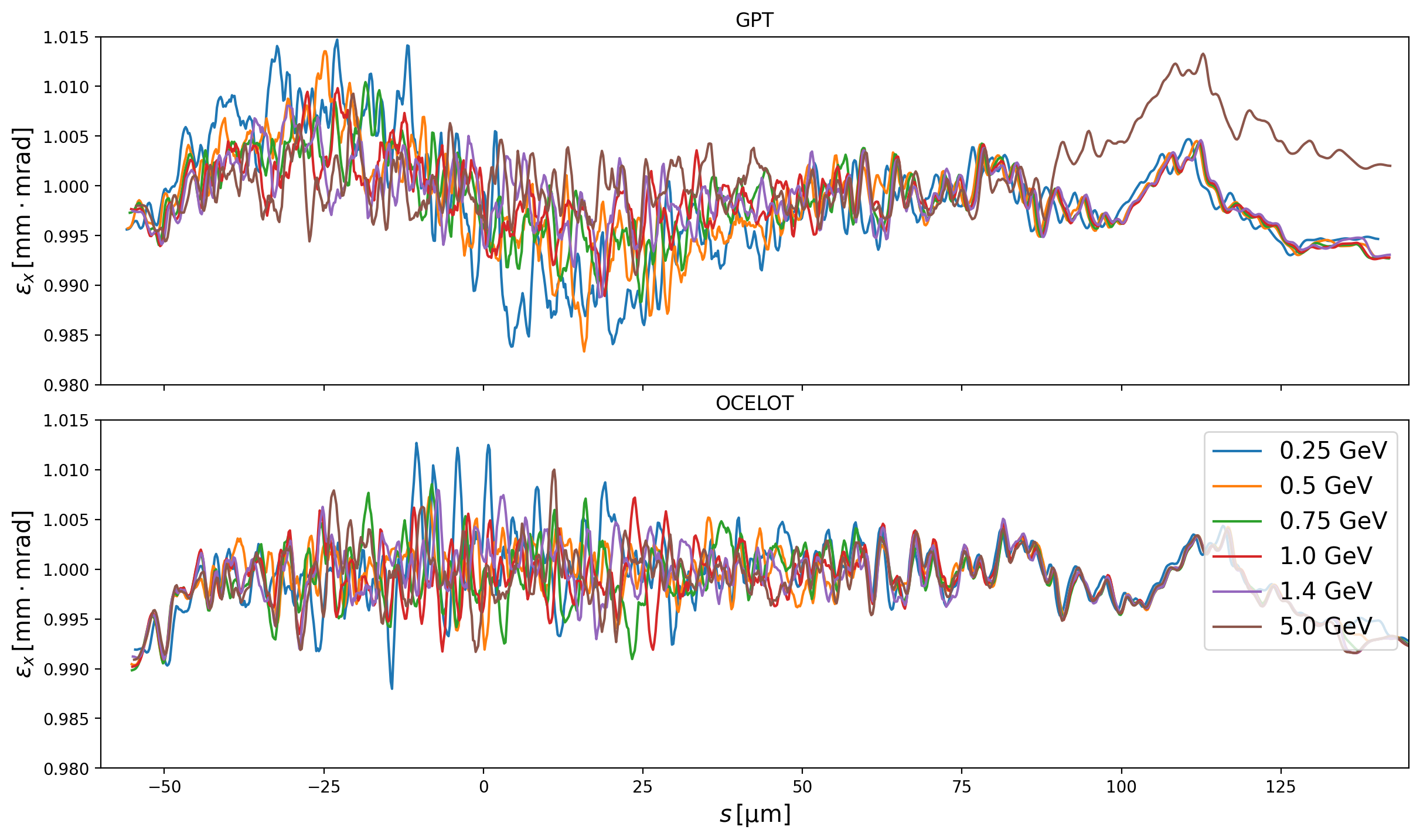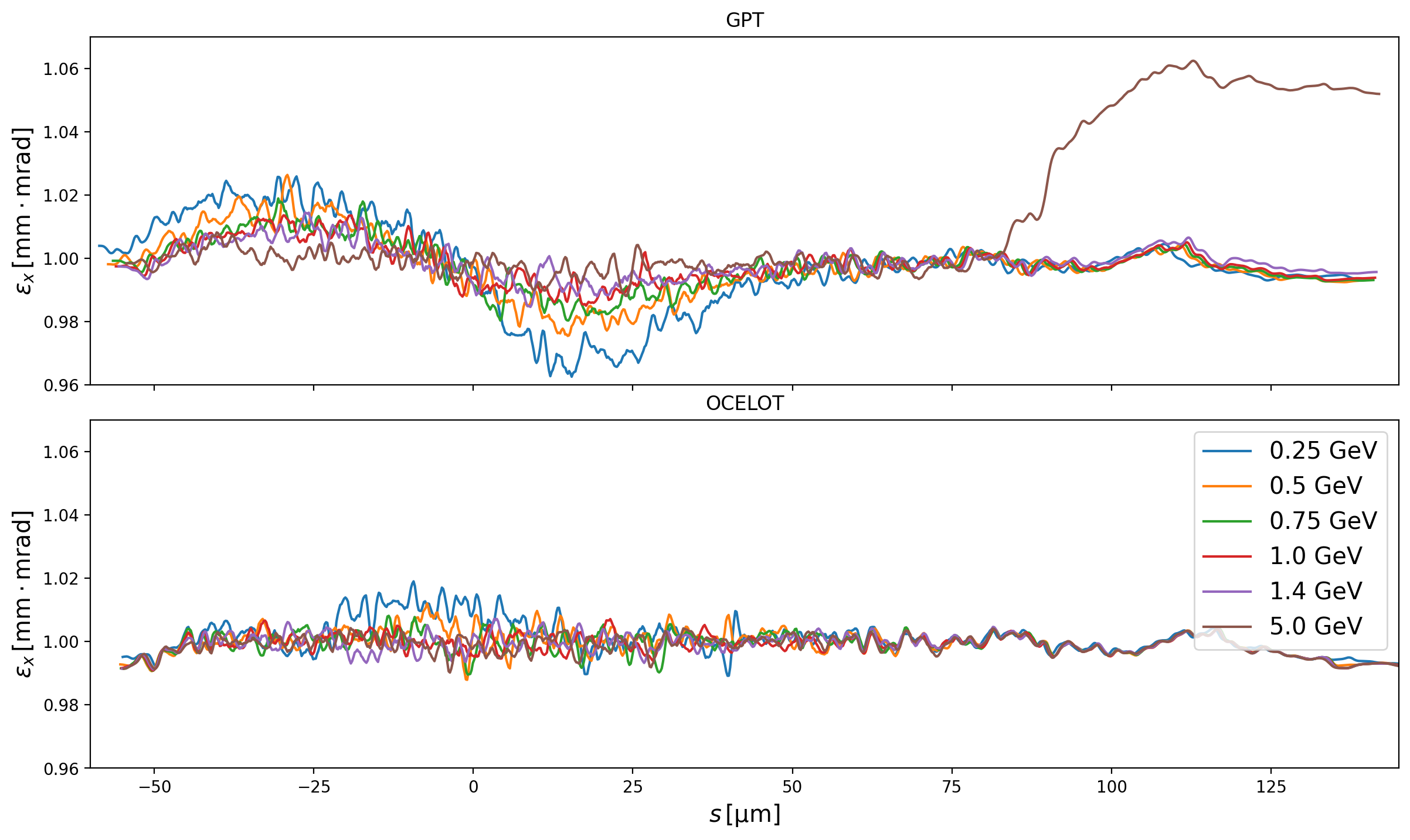 The slice emittance in GPT decreases in the middle of the bunch (corresponding to the location of the current spike) which is conspicuously absent in OCELOT and CSRTrack. To further understand this, the bunch energy was scanned from 130MeV up to 5GeV in GPT. The slice emittances are shown in Fig. 9. Firstly the energy dependence of the emittance on the central slices (where the current spike is located) is immediately clear. In general lower energies see greater decreases in the slice emittance, until at 130MeV, where the slice emittance is instead higher and shows a sinusoidal longitudinal modulation. In this case the bunch is compressed to 17kA, which is incorrect, whereas all the rest are correctly compressed to 6kA. However, it is of course true that to exclude the Coulomb term of the Liénard-Wiechert potential at 130MeV is generally erroneous anyway, which is the case here.