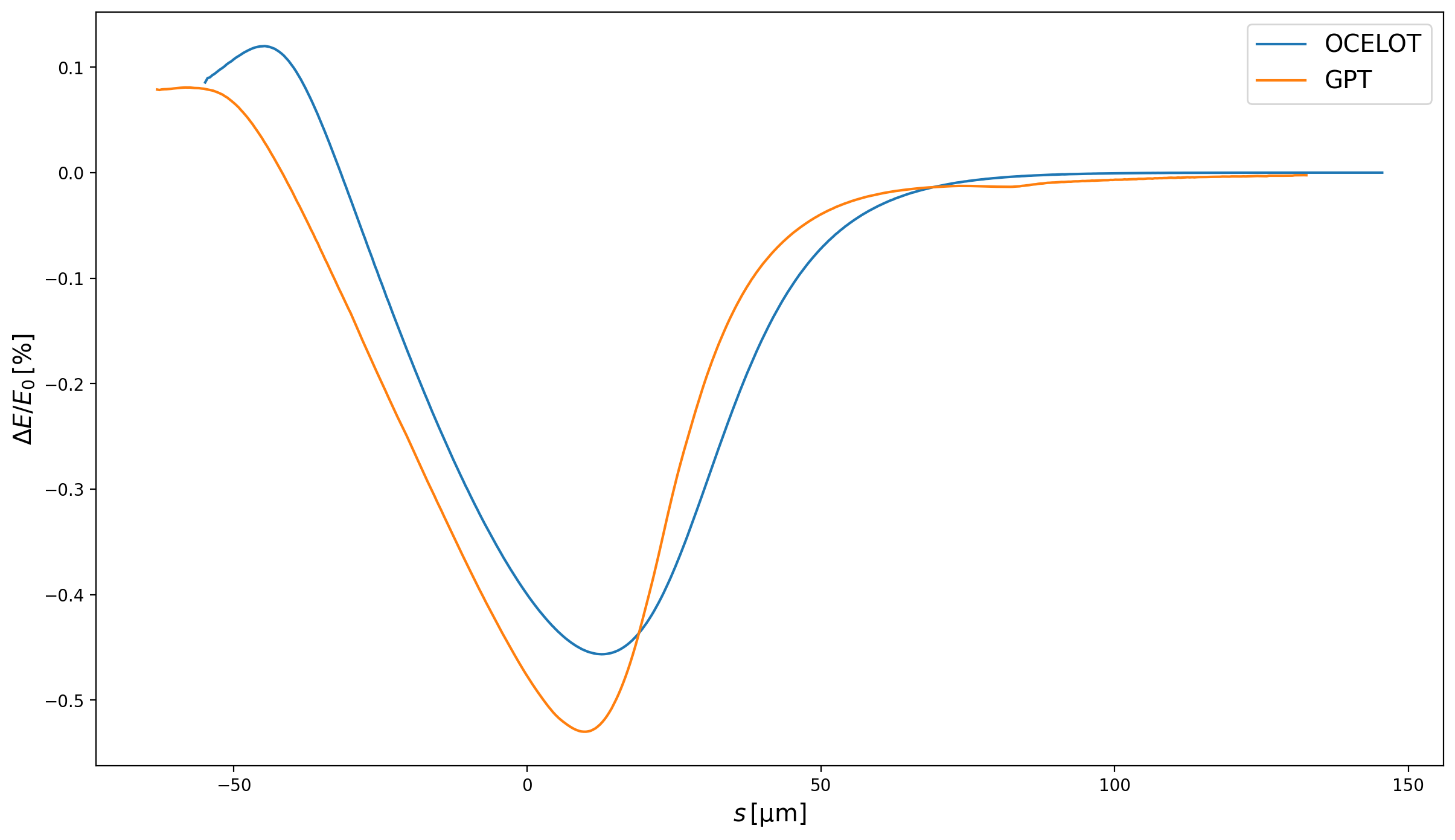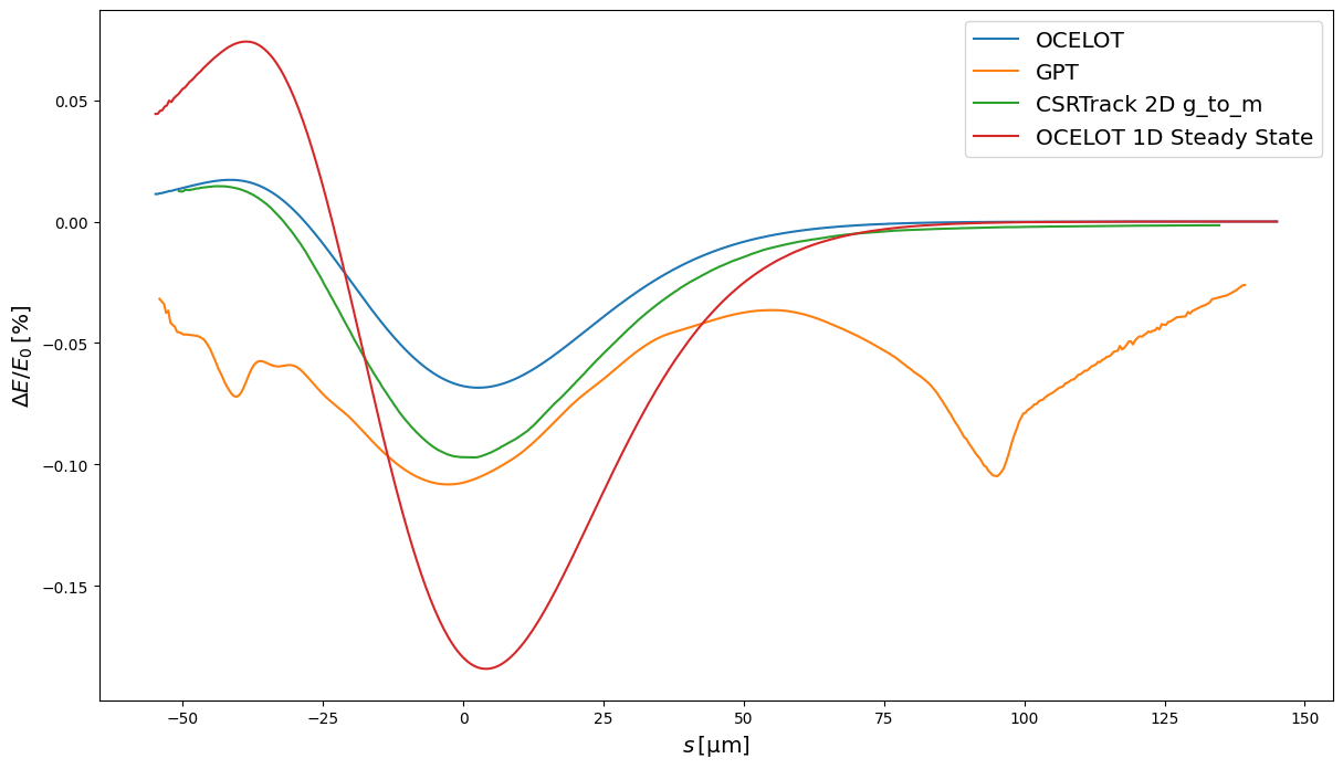 To further understand where the origins of the different features in the slice positions in Fig. 3 and Fig. 5, it is useful to look at the net normalised energy loss at the end of the chicane for the different codes. This is shown in Fig. 6. It is clear then that the unique longitudinal modulation of the slice positions comes from the idiosyncratic net wake. Furthermore, GPT can be seen to have the largest wake of the four models considered. It is remarkable that the total energy change is inversely correlated with the final projected emittance. Comparing Fig. 6 with Fig. 3 and Fig. 5, the models with the wakes in ascending order are OCELOT, CSRTrack 1D, CSRTrack 2D and finally GPT—this is the exact opposite order of the final projected emittances for the codes. A larger wake seemingly resulting in a lower projected emittance is contrary to expectations.