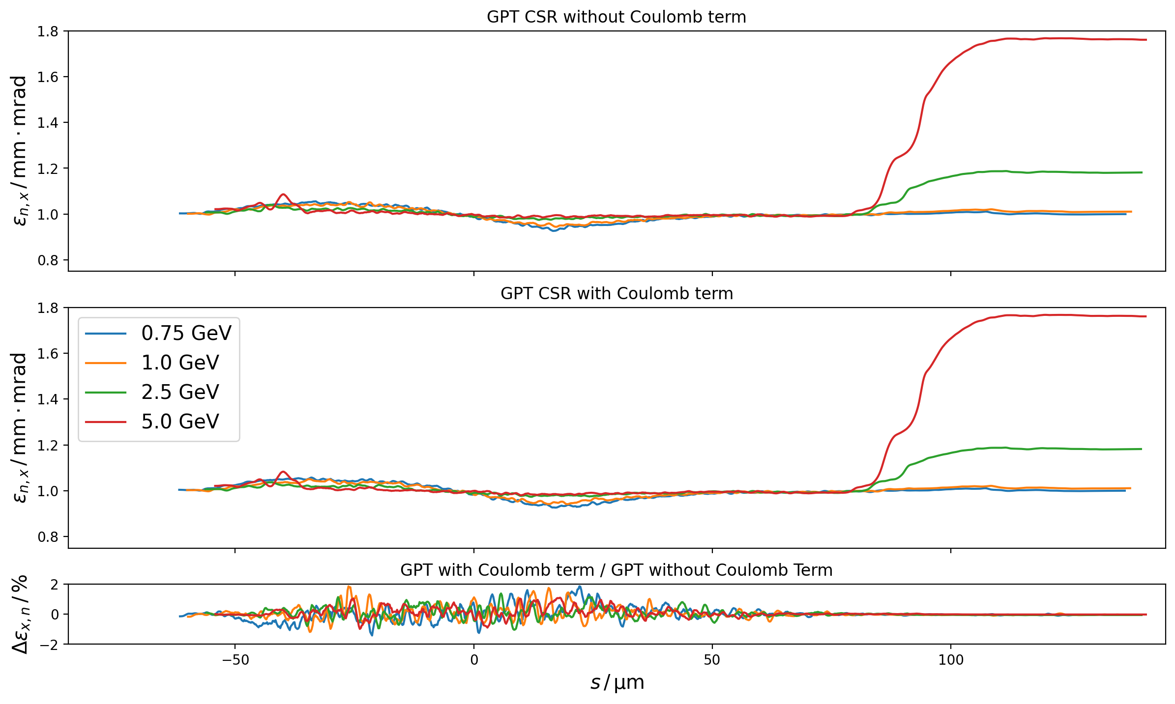 Fig. 12 Slice emittances at the end of the Zeuthen benchmark chicane in GPT with and without the Coulomb term of the Liénard-Wiechert potential for a range of energies.¶