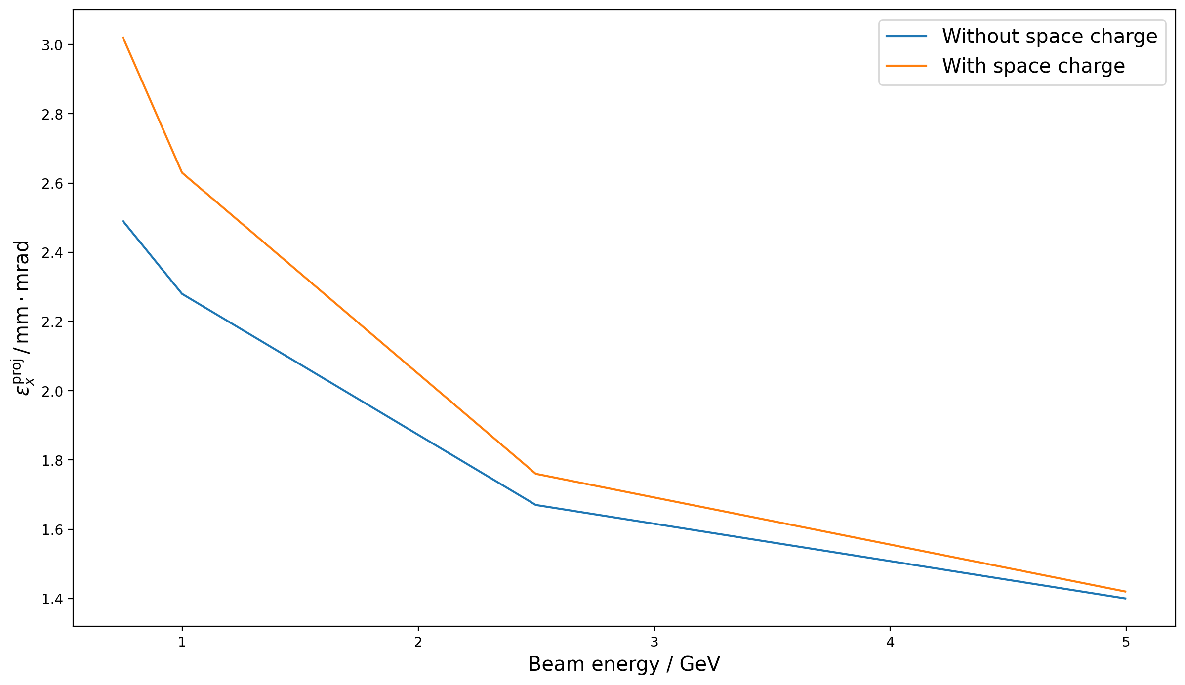 emittances for a range of energies with and without space charge are shown in