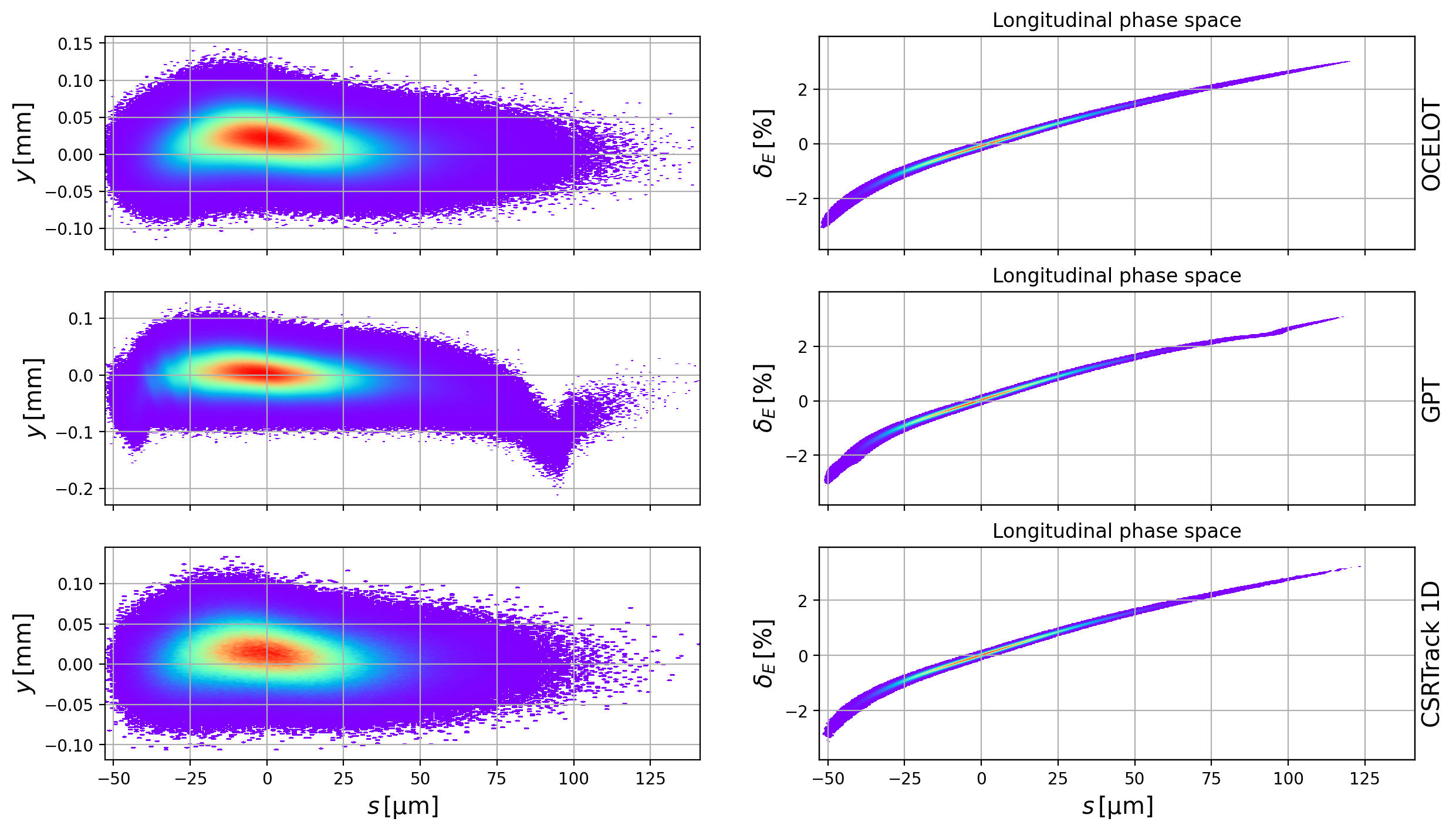 The effect of the CSR wake can be seen in Fig. 7. The transverse modulation in the longitudinal tails absent from CSRTrack and OCELOT is clearly apparent in GPT, and whilst clearly this region of the beam is relatively underpopulated, it is nevertheless clearly a real effect.
