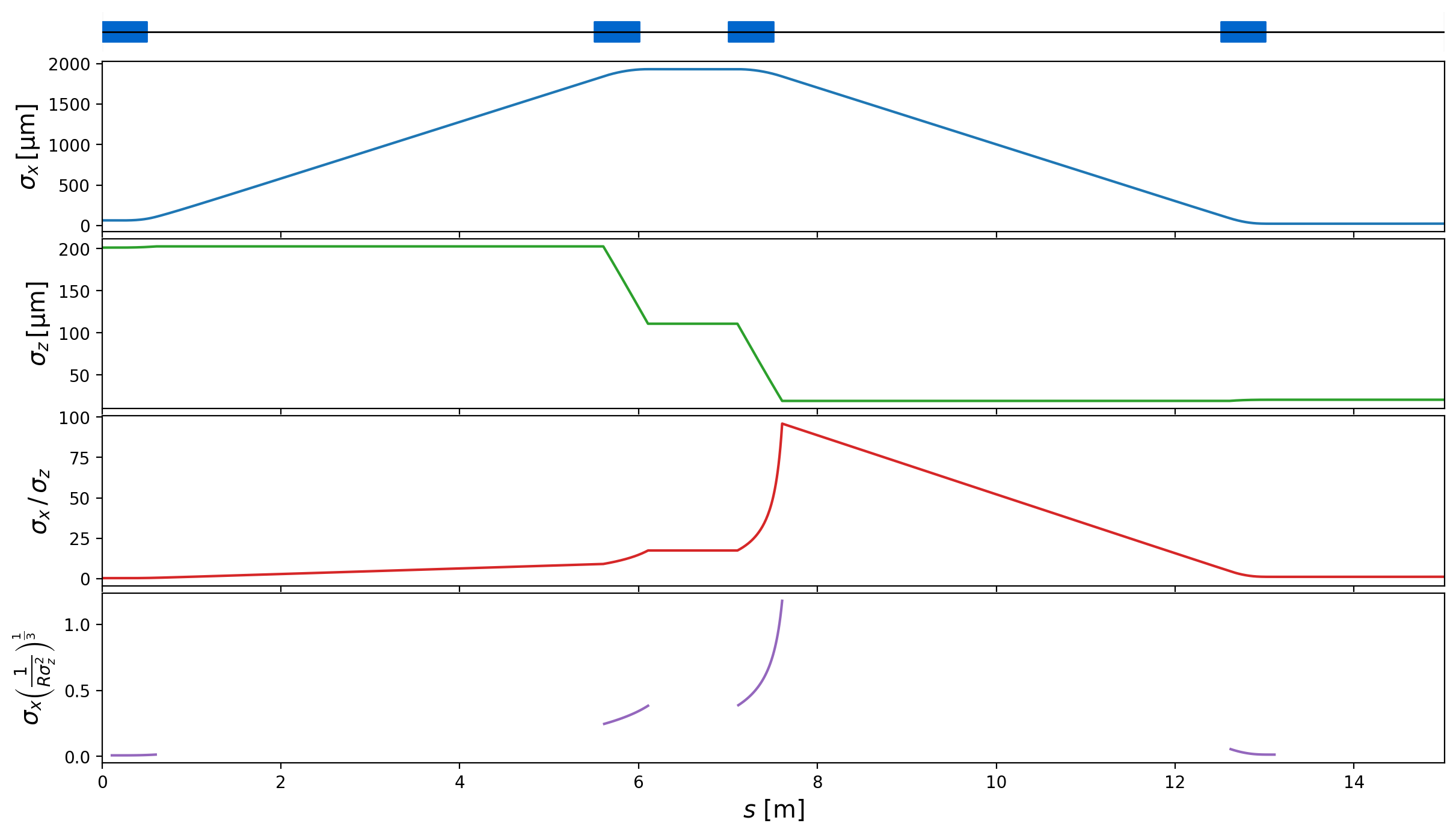 Fig. 4 The longitudinal and horizontal bunch dimensions, their ratios and the resulting Derbenev Criterion along the length of the Zeuthen benchmark chicane with the nominal beam parameters. The coefficient must be much less than 1 for the 1D approximation to hold.¶