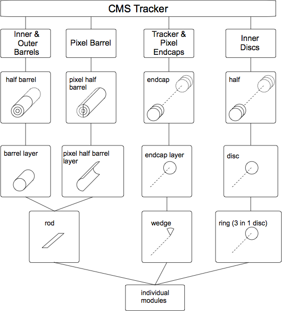 A large track detector has usually a sub-detector structure: the track detector is built from smaller units, which are built by smaller sub-units etc. down to the level of a single sensor. The different levels can be visualized by a tree structure. Figure 2 shows the tree structure of the cms detector.