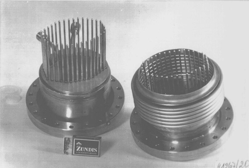 A bellows unit allowing flexible connection between sections of beam pipe in adjacent magnets. Note the metal fingers which slide in complementary holes