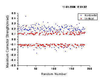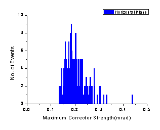 For estimation of maximum horizontal corrector strength, 200 random corrections are made and the maximum corrector strengths are saved. It shows that a maximum of 0.5mrad is sufficient to carry out the slow orbit correction scheme for PETRA III. The results are reproduced below.