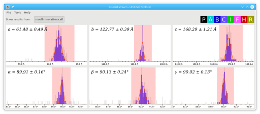 A definite trend seems to be emerging, of an orthorhombic C cell with axes close to 61.5, 123 and 168 A (note the units in the stream)! You could import the lists of numbers into your favourite graphing program to make a nice histogram. You can also use the CrystFEL Unit Cell Explorer to examine the distributions. Run it with the stream as an argument: