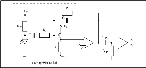 Der in Abbildung 9 dargestellte Vorverstärker wird im Desy-Detektor verwendet und wurde im Max-Planck-Institut für Physik und Astrophysik (MPI) in München entwickelt und von der Firma Schrack, Wien, hergestellt. Er besteht aus einem landungsempfindlichen Verstärker und einem symmetrischen Leitungstreiber. Alle Widerstände wurden in Dickfilmtechnik hergestellt und im Betrieb getrimmt. Als weitere Bauteile erkennt man in SMD-Bauform die Kondensatoren und Transistoren. Das IC enthält 8 einzelne Transistoren. Die nachträglich eingelöteten Widerstände ersetzen mit ihrem Gesamtwiderstand von 20 MW den mit 2 MW vorgesehenen Rückkoppelwiderstand Rf.